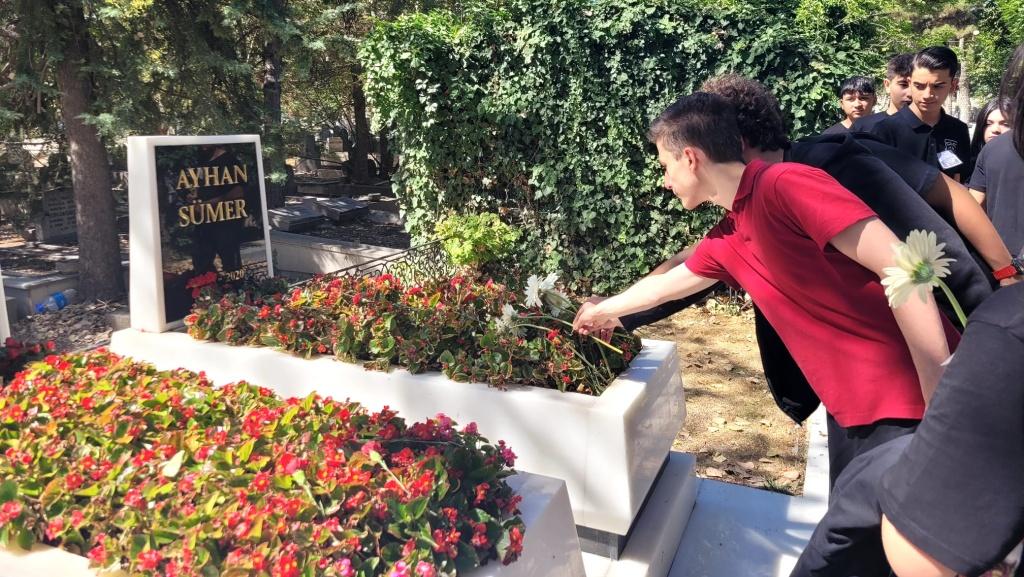 Öğrencilerimiz ve öğretmenlerimiz, Ayhan Sümer’in kabrine çiçekler bırakarak dualar ettiler. Okulumuzun bugünlere gelmesinde büyük emeği olan hayırseverimizi saygı ve minnetle andığımız bu ziyarette, Sümer ailesine olan şükran bir kez daha dile getirildi.